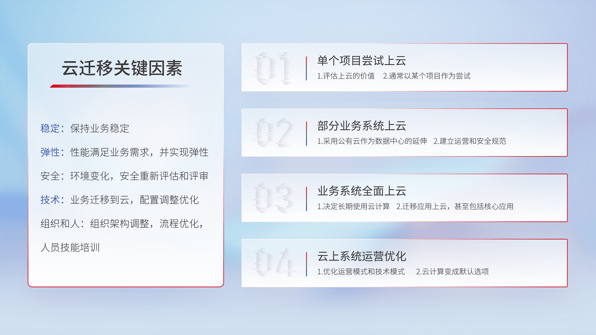 结合实际业务,,,从规划设计、、云平台选型、、、云原生改造、、、数据迁移、、、、集成交付,,,,迁移全过程为客户识别最佳上云路径,,做好风险识别管理,,,设计网络架构、、身份权限、、、、安全审计合规、、操作审计、、日志审计、、、监控告警策略、、、、多站点容灾设计等,,对云上基础设施进行整体规划,,提升IT治理水平,,以满足弹性、、、、高可用、、高性能的需求。。。